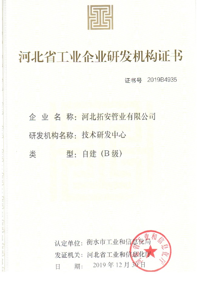 河北省工業(yè)企業(yè)研發(fā)機(jī)構(gòu)證書B(niǎo)