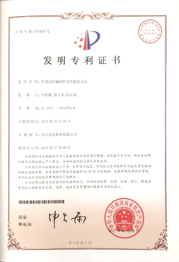 礦用瓦斯抽放管證書