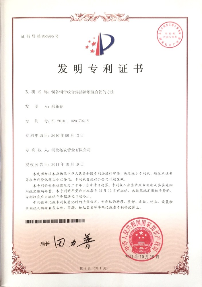 制備鋼帶咬合焊接涂塑復合管的方法證書